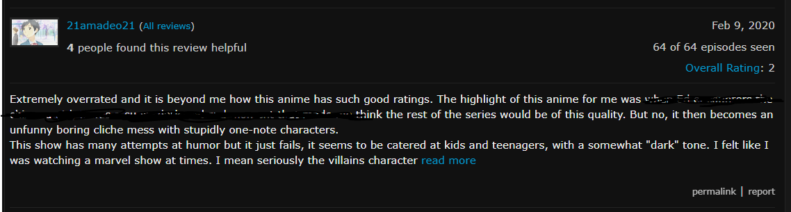 I often see reviewers get ridiculed for bashing anime that is overwhelmingly deemed good by the community. Although their reasoning does not always have the clearest comprehension, the backlash and mob mentality that inevitably ensues is quite concerning. So much so, that MAL was forced to take down the ‘Not Helpful’ vote from user reviews in order to prevent further harassment and trolling.