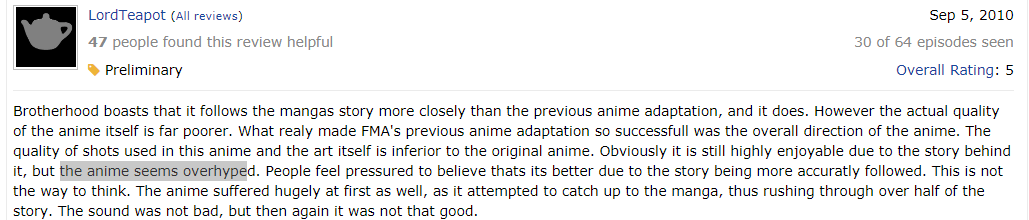 Just to be perfectly clear, you will always have someone else disagree with your judgment of a show. Just take a look at the most recent Fullmetal Alchemist: Brotherhood’s MyAnimeList (MAL) reviews. Despite being the most widely accepted anime to take the title for best of all time, the show still racks up lowly reviews from people who swear it was nothing more than a hype job, a mediocre title at best. They are quite the questionable take, but a take nonetheless.